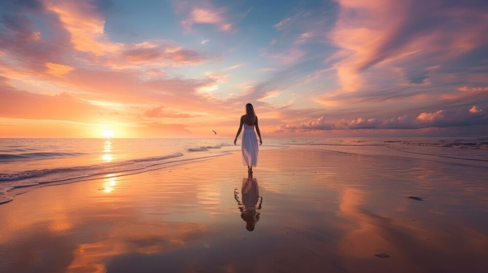 I watch our feet touch each other in the moisture of the sand in an existential continuum, and I realize that I am this subtle and angelic being, and also, the dense and physical being that observes it. We touch and intertwine in unity — two beings creating a reality, two entities evolving in communion. We exist in this moment for each other, experiencing a love that transcends dimensions and worlds, and thus, we become one.